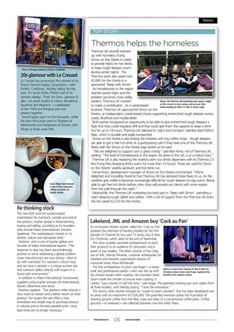 Thermos UK recently teamed up with homeless charity Simon on the Streets in Leeds to provide flasks for hot drinks to keep rough sleepers warm during winter nights. The Thermos team also raised over £2,000 for the charity in a sponsored ‘Sleep with Simon’. As homelessness in the region reaches record highs and the problem becomes more visibly Above: The Thermos UK marketing team spent a night evident, Thermos UK wanted on the streets to raise money and increase their to make a contribution. As a Leeds-based understanding of what it is like to sleep rough. business, Thermos UK approached Simon on the Streets, an independent, Leeds-based charity supporting entrenched rough sleepers across Leeds, Bradford and Huddersfield. Both parties recognised an opportunity to be able to give entrenched rough sleepers a flask that they could regularly refill and that could give them the capacity to keep a drink hot for up to 18 hours. Thermos UK selected its ‘Light and Compact’ stainless steel 500ml flask, which is durable and easily transported. Simon on the Streets is also linking the initiative with key coffee shops. Rough sleepers are able to get a free hot drink at a participating cafe if they have one of the Thermos UK flasks with the Simon on the Streets logo sticker on its back. “We are delighted to support such a great charity,” said Nick Kime, md of Thermos UK, adding: “The level of homelessness in the region, let alone in the UK, is at a critical mass.” Thermos UK is also replacing the charity’s worn out drinks dispensers with its Thermos 2.5 litre Pump Pots (keeping drinks warm for more than 12 hours). These are used for Simon on the Streets’ weekly sandwich and hot drink run. Fahad Khan, development manager of Simon on the Streets commented: “We’re delighted and incredibly thankful that Thermos UK has donated these flasks to us. As the weather gets colder it becomes increasingly difficult for rough sleepers to stay warm. Being able to get free hot drinks before cafes close will provide our clients with some respite from the cold through the night.” Meanwhile, the Thermos UK marketing trio took part in ‘Sleep with Simon’, spending a night sleeping rough (albeit very safely). With a lot of support from the Thermos UK team, the trio raised £2,370 for the charity.