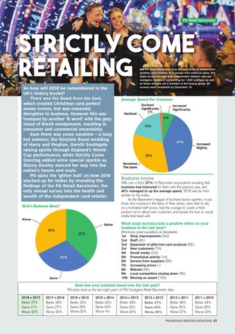 How has your business fared over the last year? PG looks back at the last eight year’s of PG/Cardgains Retail Barometer data. 2018 v 2017 Better 37% Same 31% Worse 32%