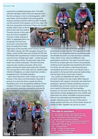 70 – the number of riders who started the ride 70 – the number of riders who finished the ride 2,567 – the number of photographs taken 9 – the amount of punctures suffered 1,120 – the number of pints consumed (including the Friday night party at the Guinness Store House) 1.96 million – calories burnt 700 – sausages eaten 21,500 – number of miles cycled 23,760 – number of feet climbed 2 – number of toilets blocked LICENSING SOURCE BOOK EUROPE 2018
