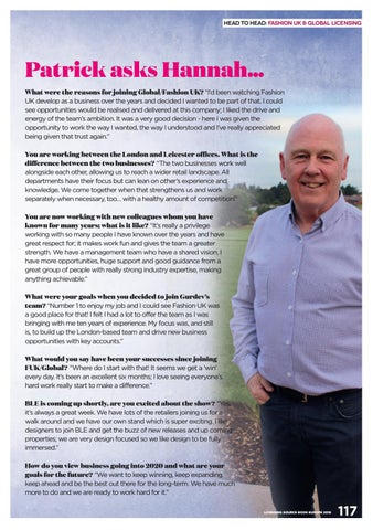 Patrick asks Hannah… What were the reasons for joining Global/Fashion UK? “I’d been watching Fashion UK develop as a business over the years and decided I wanted to be part of that. I could see opportunities would be realised and delivered at this company; I liked the drive and energy of the team’s ambition. It was a very good decision - here I was given the opportunity to work the way I wanted, the way I understood and I’ve really appreciated being given that trust again.” You are working between the London and Leicester offices. What is the difference between the two businesses? “The two businesses work well alongside each other, allowing us to reach a wider retail landscape. All departments have their focus but can lean on other’s experience and knowledge. We come together when that strengthens us and work separately when necessary, too… with a healthy amount of competition!” You are now working with new colleagues whom you have known for many years; what is it like? “It’s really a privilege working with so many people I have known over the years and have great respect for; it makes work fun and gives the team a greater strength. We have a management team who have a shared vision, I have more opportunities, huge support and good guidance from a great group of people with really strong industry expertise, making anything achievable.” What were your goals when you decided to join Gurdev’s team? “Number 1 to enjoy my job and I could see Fashion UK was a good place for that! I felt I had a lot to offer the team as I was bringing with me ten years of experience. My focus was, and still is, to build up the London-based team and drive new business opportunities with key accounts.” What would you say have been your successes since joining FUK/Global? “Where do I start with that! It seems we get a ‘win’ every day. It’s been an excellent six months; I love seeing everyone’s hard work really start to make a difference.” BLE is coming up shortly, are you excited about the show? “Yes, it’s always a great week. We have lots of the retailers joining us for a walk around and we have our own stand which is super exciting. I like designers to join BLE and get the buzz of new releases and up coming properties; we are very design focused so we like design to be fully immersed.” How do you view business going into 2020 and what are your goals for the future? “We want to keep winning, keep expanding keep ahead and be the best out there for the long-term. We have much more to do and we are ready to work hard for it.” LICENSING SOURCE BOOK EUROPE 2018