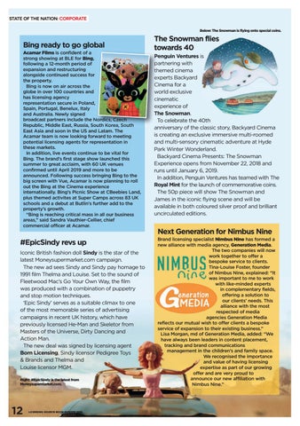 The Snowman flies towards 40 Penguin Ventures is partnering with themed cinema experts Backyard Cinema for a world exclusive cinematic experience of The Snowman. To celebrate the 40th anniversary of the classic story, Backyard Cinema is creating an exclusive immersive multi-roomed and multi-sensory cinematic adventure at Hyde Park Winter Wonderland. Backyard Cinema Presents: The Snowman Experience opens from November 22, 2018 and runs until January 6, 2019. In addition, Penguin Ventures has teamed with The Royal Mint for the launch of commemorative coins. The 50p piece will show The Snowman and James in the iconic flying scene and will be available in both coloured silver proof and brilliant uncirculated editions.