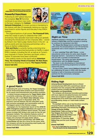 Aardman enjoyed a strong start to 2018 with the release of Early Man, and the company is looking to continue its momentum into BLE. The Shaun the Sheep brand continues to flourish with series five broadcasting in over 170 territories worldwide and a movie sequel in production for 2019. In June, Learning Time with Timmy – a new educational online series for early years English language learners – launched on YouTube and will roll out with a number of international broadcasters. The series has been developed in collaboration with the British Council. The team is also developing an international publishing and licensing programme to further extend the brand. On top of this, classic brand Wallace & Gromit will be celebrating 30 years in 2019, with the studio looking to talk to licensing and promotional partners for the anniversary campaign.