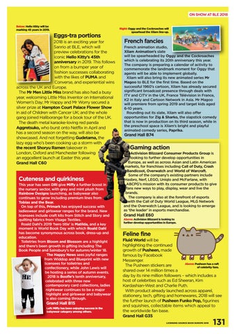 Fluid World will be highlighting the continued growth of Pusheen, made famous by Facebook Messenger. Above: Pusheen has a raft The Pusheen stickers are of celebrity fans. shared over 14 million times a day by its nine million followers – which includes a host of celebrities such as Ed Sheeran, Kim Kardashian-West and Charlie Puth. With product already launched across apparel, stationery, tech, gifting and homewares, 2018 will see the further launch of Pusheen Funko Pop, figurines and squishies, collectable items which appeal to the worldwide fan base. Grand Hall G35 LICENSING SOURCE BOOK EUROPE 2018