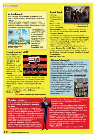 Marking a significant move into developing off-air opportunities Above: Peaky Blinders will for its scripted be key for Endemol. brands, Endemol Shine Group is driving international licensing for the critically acclaimed dramas Peaky Blinders and Black Mirror. In addition, the company is also continuing to grow the global licensing footprint of MasterChef – notably, two of the show’s finalists, including this year’s winner Kenny Tutt, will take part in live sessions in the BLE Kitchen. Other brands on display from Endemol will include Simon’s Cat and Mr Bean, while it is also looking to expand the licensing programmes for Big Brother, Hunted, Pointless, Tenable, The Wall and Wipeout. National Hall E100