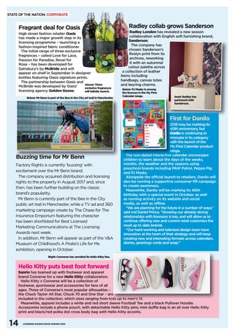 High street fashion retailer Oasis has made a major growth step in its licensing programme – launching a fashion-inspired fabric conditioner. The initial range of three exclusive fragrances – called Love for Lace, Passion for Paradise, Revel for Rose – has been developed for Sainsbury’s by McBride and will appear on shelf in September in designer bottles featuring Oasis signature prints. The partnership between Oasis and Above: Three McBride was developed by Oasis’ exclusive fragrances licensing agency Golden Goose. will initially launch. Below: Mr Benn is part of the Bee in the City art trail in Manchester.