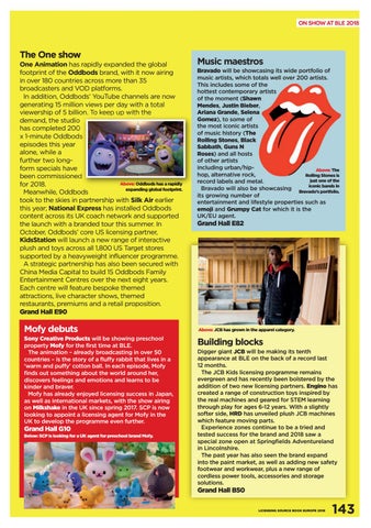 One Animation has rapidly expanded the global footprint of the Oddbods brand, with it now airing in over 180 countries across more than 35 broadcasters and VOD platforms. In addition, Oddbods’ YouTube channels are now generating 15 million views per day with a total viewership of 5 billion. To keep up with the demand, the studio has completed 200 x 1-minute Oddbods episodes this year alone, while a further two longform specials have been commissioned Above: Oddbods has a rapidly for 2018. expanding global footprint. Meanwhile, Oddbods took to the skies in partnership with Silk Air earlier this year; National Express has installed Oddbods content across its UK coach network and supported the launch with a branded tour this summer. In October, Oddbods’ core US licensing partner, KidsStation will launch a new range of interactive plush and toys across all 1,800 US Target stores supported by a heavyweight influencer programme. A strategic partnership has also been secured with China Media Capital to build 15 Oddbods Family Entertainment Centres over the next eight years. Each centre will feature bespoke themed attractions, live character shows, themed restaurants, premiums and a retail proposition. Grand Hall E90