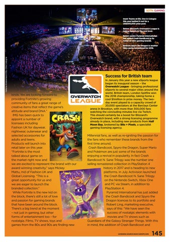 SOTN: GAMING Inset: Teams at ESL One in Cologne this year battled it out for a US$300,000 prize pool. Below: Blizzard’s Overwatch League is taking esports to the next level. Below centre: Pyramid International has added Crash Bandicoot to its roster of retro gaming brands.