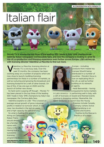 alentina La Macchia, licensing director at Mondo TV, is one busy lady. Over the past 12 months, the company has been working away on a number of projects which are now close to launch, building licensing partnerships for these in a number of markets, as well as nurturing and growing the broadcast and licensing footprint for a raft of other brands. On top of this, it has one eye on 2020 and the launch of further new shows. Its hard work is paying off though – Mondo TV has been placed in the top three of the leading 500 ‘made in Italy’ SME champions by Italy’s top newspaper, the Corriera della Sera. Valentina explains to LSB: “This is based on average annual growth of gross industrial profits in relation to turnover which, in our case, has doubled in the last six years, and a high capacity for self-financing.” So what is fuelling this growth? Airing on Cartoonito, Robot Trains should already be a familiar name with many in the UK. Having built a successful licensing programme in Inset: MeteoHeroes addresses issues such as climate change, ecology and respect for nature.