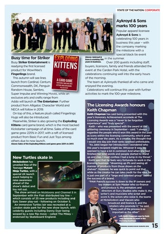 Popular apparel licensee Aykroyd & Sons is celebrating 100 years in business this year – with the company marking the milestone with a special black tie event Above: Aykroyd & Sons is marking 100 in the summer. years in business. Over 200 guests including staff, buyers, licensors, family and friends attended the event at the Carden Park Hotel, with the celebrations continuing well into the early hours of the morning. The team at Aykroyds thanked all who came and enjoyed the evening. Celebrations will continue this year with further activities to mark the 100-year milestone.