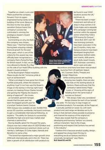 be found in over 1,000 Together as a team, Lucio and locations across the UK,” Meera pushed the company continues Jo. forward. From its paper“There has been a major engineered Swing Cards, to the investment and roll out of building of the iconic Bang on shop in shop corners in El the Door to the now global Corte Ingles and a separate sensation Gorjuss brand, the BTS campaign running last company’s success has summer within the apparel culminated in winning the sector where they hold a prestigious Queen’s Award DTR licence for Gorjuss.” for Enterprise. Since BLE 2017, over 40 Commenting on why she feels new licensing contracts the company was chosen, have been executed. In the Meera says: “I feel that Santoro, last 12 months, many new having been enjoying a steady Gorjuss products have been financial growth for the past developed ranging from three years, which is one of the beachwear, bottled water, criteria for this award, has now corn snacks, dolls prams, officially been recognised as a plush dolls, beach towels, company that is flying the flag Above: Meera Santoro meeting Prince Charles at the recent Awards event. EDT, footwear, cosmetics, for British export. In fact, we are Below: Gorjuss plush doll. picnic ware and cake now allowed to literally fly a flag decorations and there have been new product on the side of our Head Office building with the launches from UK partners Sequin Queen’s Award emblem.” Art, Cooneen, Bothy Threads and At the Buckingham Palace reception, Design Objectives. Meera recalls she felt “immense pride at While existing brands are reaching such an achievement”. dizzying new heights, there are also “What a privilege to have gone from those new kids on the starting blocks at humble postcards, where the closest to Santoro. Meera enthuses that the anything ‘royal’ in our lives was the Queen’s company’s latest brand, Poppi image on the stamps in the top right-hand Loves, is “showing all the signs of corners, to meeting Prince Charles himself heading down the same road of and gaining Her Majesty the Queen’s success as Gorjuss”. stamp of approval?” she muses. “We always make very considered Jo Campbell, general manager, design choices for each of our brands,” reveals that the past year has she adds. “It’s too easy to slap images on been the biggest growth year for standard products. For example, all the Poppi art a lynchpin Santoro brand, Gorjuss. is actually painted on wood. So, with each With Gorjuss now available at over 35,000 POS product and card range we develop we try to across 93 countries worldwide, the brand continues bring in that element where possible to preserve to gain a considerable international following. Jo and channel the essence of the original art.” explains: “The ability for Gorjuss to successfully Meera also reveals that the company is straddle the high-end and mass market retail developing and licensing ‘Santoro’ as a brand, channels is behind this.” without characters “due to the image, Having steadily grown for the past five years, positioning and respect that Santoro has earned Gorjuss now has a retail value of USD172million and in the industry”. a strong retail presence in premium stores such as “I believe this is because product quality, design, Hamley’s, Selfridges, El Corte Ingles, Harrods and and appeal has always been the key to Benetton to name a few. everything we do at Santoro and this is “The brand has experienced a major growth since universally recognised,” says Meera. 2016 both internationally and in the UK. There has BLE Stand E2 and E5 been a growth of UK distribution with products to LICENSING SOURCE BOOK EUROPE 2018