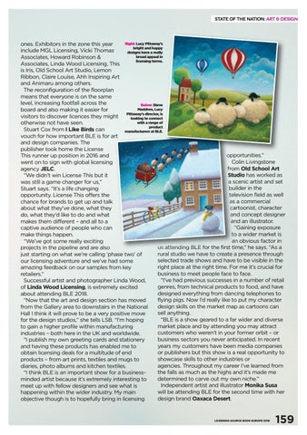 Right: Lucy Pittaway's ones. Exhibitors in the zone this year bright and happy include MGL Licensing, Vicki Thomas designs have a really broad appeal in Associates, Howard Robinson & licensing terms. Associates, Linda Wood Licensing, This is Iris, Old School Art Studio, Lemon Ribbon, Claire Louise, Ahh Inspiring Art and Animaru among others. The reconfiguration of the floorplan means that everyone is on the same level, increasing footfall across the Below: Steve Maddren, Lucy board and also making it easier for Pittaway's director, is visitors to discover licences they might looking to connect with a range of otherwise not have seen. product Stuart Cox from I Like Birds can manufacturers at BLE. vouch for how important BLE is for art and design companies. The publisher took home the License opportunities.” This runner up position in 2016 and Colin Livingstone went on to sign with global licensing from Old School Art agency JELC. Studio has worked as “We didn’t win License This but it a scenic artist and set was still a game changer for us,” builder in the Stuart says. “It’s a life changing television field as well opportunity. License This offers the as a commercial chance for brands to get up and talk cartoonist, character about what they’ve done, what they and concept designer do, what they’d like to do and what and an illustrator. makes them different – and all to a “Gaining exposure captive audience of people who can to a wider market is make things happen. an obvious factor in “We’ve got some really exciting us attending BLE for the first time,” he says. “As a projects in the pipeline and are also rural studio we have to create a presence through just starting on what we’re calling ‘phase two’ of selected trade shows and have to be visible in the our licensing adventure and we’ve had some right place at the right time. For me it’s crucial for amazing feedback on our samples from key business to meet people face to face. retailers.” “I’ve had previous successes in a number of retail Successful artist and photographer Linda Wood, genres, from technical products to food, and have of Linda Wood Licensing, is extremely excited designed everything from dancing telephones to about attending BLE 2018. flying pigs. Now I’d really like to put my character “Now that the art and design section has moved design skills on the market map as cartoons can from the Gallery area to downstairs in the National sell anything. Hall I think it will prove to be a very positive move “BLE is a show geared to a far wider and diverse for the design studios,” she tells LSB. “I’m hoping market place and by attending you may attract to gain a higher profile within manufacturing customers who weren’t in your former orbit – or industries – both here in the UK and worldwide. business sectors you never anticipated. In recent “I publish my own greeting cards and stationery years my customers have been media companies and having these products has enabled me to or publishers but this show is a real opportunity to obtain licensing deals for a multitude of end showcase skills to other industries or products – from art prints, textiles and mugs to agencies. Throughout my career I’ve learned from diaries, photo albums and kitchen textiles. the falls as much as the highs and it’s made me “I think BLE is an important show for a businessdetermined to carve out my own niche.” minded artist because it’s extremely interesting to Independent artist and illustrator Monika Susa meet up with fellow designers and see what is will be attending BLE for the second time with her happening within the wider industry. My main design brand Oaxaca Desert. objective though is to hopefully bring in licensing
