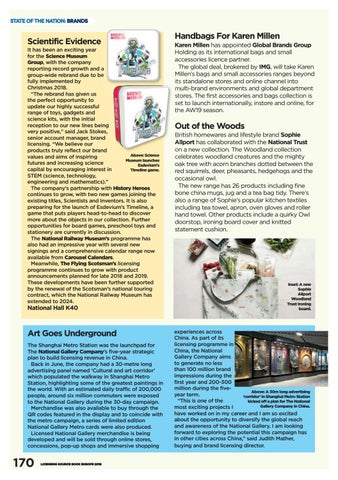 It has been an exciting year for the Science Museum Group, with the company reporting record growth and a group-wide rebrand due to be fully implemented by Christmas 2018. “The rebrand has given us the perfect opportunity to update our highly successful range of toys, gadgets and science kits, with the initial reception to our new lines being very positive,” said Jack Stokes, senior account manager, brand licensing. “We believe our products truly reflect our brand Above: Science values and aims of inspiring Museum launches futures and increasing science Esdevium’s capital by encouraging interest in Timeline game. STEM (science, technology, engineering and mathematics).” The company’s partnership with History Heroes continues to grow, with two new games joining the existing titles, Scientists and Inventors. It is also preparing for the launch of Esdevium’s Timeline, a game that puts players head-to-head to discover more about the objects in our collection. Further opportunities for board games, preschool toys and stationery are currently in discussion. The National Railway Museum’s programme has also had an impressive year with several new signings and a comprehensive calendar range now available from Carousel Calendars. Meanwhile, The Flying Scotsman’s licensing programme continues to grow with product announcements planned for late 2018 and 2019. These developments have been further supported by the renewal of the Scotsman’s national touring contract, which the National Railway Museum has extended to 2024.