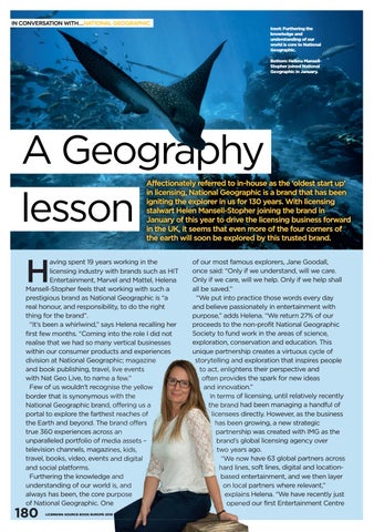 aving spent 19 years working in the licensing industry with brands such as HIT Entertainment, Marvel and Mattel, Helena Mansell-Stopher feels that working with such a prestigious brand as National Geographic is “a real honour, and responsibility, to do the right thing for the brand”. “It’s been a whirlwind,” says Helena recalling her first few months. “Coming into the role I did not realise that we had so many vertical businesses within our consumer products and experiences division at National Geographic; magazine and book publishing, travel, live events with Nat Geo Live, to name a few.” Few of us wouldn’t recognise the yellow border that is synonymous with the National Geographic brand, offering us a portal to explore the farthest reaches of the Earth and beyond. The brand offers true 360 experiences across an unparalleled portfolio of media assets – television channels, magazines, kids, travel, books, video, events and digital and social platforms. Furthering the knowledge and understanding of our world is, and always has been, the core purpose of National Geographic. One