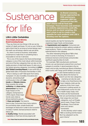 Sustenance for life Life’s Little Certainties Anna Knight, brand director, Brand Licensing Europe “They say there are two things in life we can be certain of: death and taxes. I’m not so sure. I’d like to add a third: that for as long as human beings roam this earth we will always need to eat and drink. So, when it comes to business, what better investment to make than in something that is impossible to not be in demand. This is one of the reasons the food and beverage category is one of the most robust within licensing and one of the few categories that can rely on the stable provision of retail shelf space. It’s also one of the fastest growing categories. According to LIMA’s 2017 Global Licensing Report, it was worth 6% of global retail sales of licensed merchandise in 2016. Why’s it doing so well? Well apart from being ‘evergreen’, it’s also incredibly innovative and dynamic, reinventing itself continuously in line with new trends and lifestyle choices. Most recently the whole wellbeing and clean-eating phenomenon has had a huge impact on the category. Going back to LIMA’s report, three major trends were cited as drivers behind its growth. 1. Clean and simple: This trend is here to stay. Consumers have many options for purchasing clean, simple foods and beverages at retail and in order to be successful in today’s market, licensed products need to follow suit. 2. Healthy living: Brands associated with vegetables or that have strong organic/all-