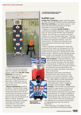 Design Plus Licensing, master licensing agent for ICEE and SLUSH PUPPiE brands, appointed Pink Key Licensing as European agent in June 2016 and their partnership has now been extended until the end of 2020. Steeped in nostalgia SLUSH PUPPiE is anything but rooted in the past. Today’s adults grew up with SLUSH PUPPiE and its beloved mascot, and the Pup is as popular with their children as it was all those years ago. “This has proven to be the basis of a slightly unexpected hit within the licensing industry,” says md Richard Pink. “To date nine licensees have been appointed covering a huge range of products.” Recent products include pencil cases and stationery from Helix; air fresheners from 151, frozen pouches from Manchester Drinks and apparel and accessories in development with Brand Design. “Without doubt though the star of the range is the domestic SLUSH PUPPiE Maker and its range of accessories from Fizz Creations,” enthuses Richard. “This award winning product has had sales since October last year that have been nothing short of startling. It was listed at major retailers such as Argos, Amazon and Menkind and the demand for the to inspire licensed housewares, product has been relentless, showing no with for example, the National signs of declining.” Gallery mugs from My Gift Trade. Meanwhile, taste and convenience Brabantia continues its combined with ‘tasty results in a few collaboration with the ‘Queen minutes’ and a famous brand for cake of Print’, Orla Kiely whose mixes have created a recipe for success distinctive style appeared on a for JWP’s Betty Crocker Microwave Retro Bin in 2015 and now on Cake Maker and Brownie Maker. new Flower Oval Stem ironing Paul Birtwistle, JWP’s marketing board and cover. manager, acknowledges: “Betty Benross Marketing launched Crocker is the number one bestselling its Black + Decker utility range brand for cake mixes in the UK and earlier this year, having secured Ireland, and to our knowledge has the brand’s licence for the UK more options/varieties than any other and Europe for laundry, manual manufacturer. It is widely available in cleaning and waste products. stores across the length and breadth Benross also has distribution of of the British Isles. Having such a wellBlack + Decker ‘powered known brand, (and one synonymous cleaning’ range which includes with baking) on our products gives them Above: The SLUSH PUPPiE Maker has been an the Power Scrubber, which, an added gravitas that can only be unprecedented success. notes Benross’ md, Amit beneficial.” Junega, is “great for greasy Paul continues: “Our Betty Crocker roast trays and dishes.” Microwave Cake Maker and Brownie Maker LICENSING SOURCE BOOK EUROPE 2018