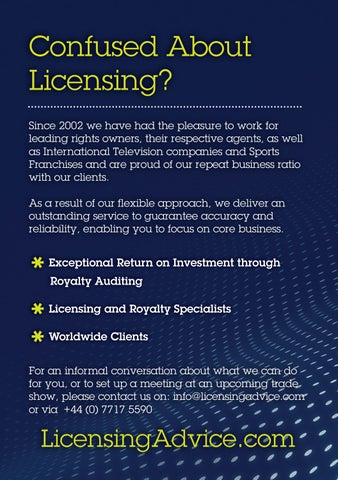 For an informal conversation about what we can do for you, or to set up a meeting at an upcoming trade show, please contact us on: info@licensingadvice.com or via +44 (0) 7717 5590