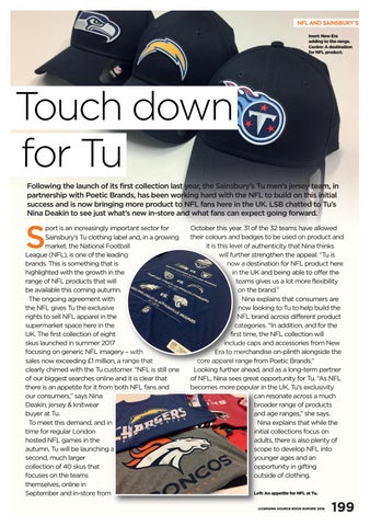October this year. 31 of the 32 teams have allowed their colours and badges to be used on product and it is this level of authenticity that Nina thinks will further strengthen the appeal: “Tu is now a destination for NFL product here in the UK and being able to offer the teams gives us a lot more flexibility on the brand.” Nina explains that consumers are now looking to Tu to help build the NFL brand across different product categories. “In addition, and for the first time, the NFL collection will include caps and accessories from New Era to merchandise on-plinth alongside the core apparel range from Poetic Brands.” Looking further ahead, and as a long-term partner of NFL, Nina sees great opportunity for Tu. “As NFL becomes more popular in the UK, Tu’s exclusivity can resonate across a much broader range of products and age ranges,” she says. Nina explains that while the initial collections focus on adults, there is also plenty of scope to develop NFL into younger ages and an opportunity in gifting outside of clothing. Left: An appetite for NFL at Tu. LICENSING SOURCE BOOK EUROPE 2018