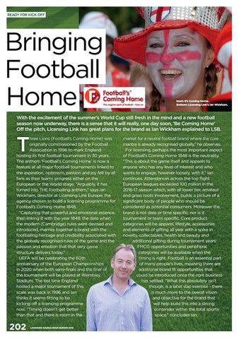 hree Lions (Football’s Coming Home) was originally commissioned by the Football Association in 1996 to mark England hosting its first football tournament in 30 years. The anthem ‘Football’s Coming Home’ is now a feature at all major football tournaments linked to the aspiration, optimism, passion and joy felt by all fans as their teams progress either on the European or the World stage. “Arguably, it has turned into THE footballing anthem,” says Ian Wickham, director at Licensing Link Europe, the agency chosen to build a licensing programme for Football’s Coming Home 1848. “Capturing that powerful and emotional essence, then linking it with the year 1848, the date when the modern (Cambridge) rules were devised and introduced, marries together a brand with the footballing heritage and credibility associated with the globally recognised rules of the game and the passion and emotion that that very game structure delivers today.” UEFA will be celebrating the 60th anniversary of the European Championships in 2020 when both semi-finals and the final of the tournament will be played at Wembley Stadium. The last time England hosted a major tournament of this scale was back in 1996 and Ian thinks it seems fitting to be kicking off a licensing programme now. “Timing doesn’t get better than that and there is room in the