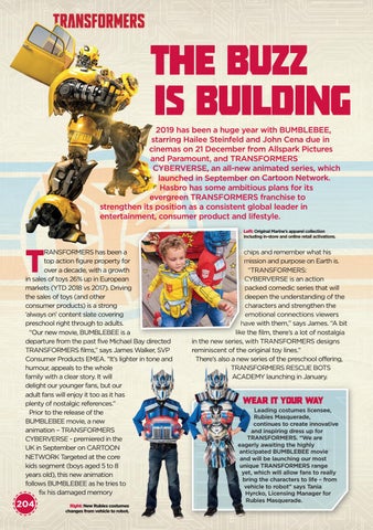 RANSFORMERS has been a top action figure property for over a decade, with a growth in sales of toys 26% up in European markets (YTD 2018 vs 2017). Driving the sales of toys (and other consumer products) is a strong ‘always on’ content slate covering preschool right through to adults. “Our new movie, BUMBLEBEE is a departure from the past five Michael Bay directed TRANSFORMERS films,” says James Walker, SVP Consumer Products EMEA. “It’s lighter in tone and humour, appeals to the whole family with a clear story. It will delight our younger fans, but our adult fans will enjoy it too as it has plenty of nostalgic references.” Prior to the release of the BUMBLEBEE movie, a new animation – TRANSFORMERS CYBERVERSE - premiered in the UK in September on CARTOON NETWORK Targeted at the core kids segment (boys aged 5 to 8 years old), this new animation follows BUMBLEBEE as he tries to fix his damaged memory