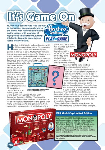 asbro is the leader in board games with a 32% market share in the G9 countries and 8 out of the top 9 face-to-face games in the G9 in 2017. MONOPOLY remains the number one gaming brand for Hasbro, and is still the fastest growing brand, but new games such as SPEAK OUT, PIE FACE, TOILET TROUBLE and FANTASTIC GYMNASTICS are carving a place as familyfavourites as well. The MONOPOLY game celebrated its 80th anniversary in 2015 and has been played by more than one billion people in 114 countries around the world and has been translated into 47 languages. Above: Clutch bags from Olympia “MONOPOLY is an Le-Tan x MONOPOLY collab. iconic game the world over,” says James Walker, SVP Consumer Products EMEA. “The brand is instantly recognisable, and we know there’s a lot of emotional attachment to the game, with many families passing the game down from generation to generation. It’s this love of the