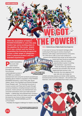 in how best to honour the brand’s heritage while continuing to find ways to evolve, ensuring its relevance with today’s (and tomorrow’s) consumers. “It’s a fine line to walk, as we must continue to preserve the elements that remain at the heart of the brand and have found an evergreen resonance, while not missing OWER RANGERS is opportunities to grow in exciting the iconic kids’ new directions,” says Simon. action brand There are three key segments for universally recognised the brand: pre-schoolers who are just throughout the world that beginning their journey in the first achieved Above: Power Rangers Super franchise, the core segment 5-10 Ninja Steel is the 25th season unprecedented success in year olds who are hungry for of POWER RANGERS. the 1990’s as a children’s content and enjoy playing out stories whilst wearing entertainment and consumer products powerhouse. licensed product and the collectors – the avid fans and Speaking about Hasbro’s acquisition of the POWER historians, who have graduated from linear content to RANGERS franchise in June of this year, Simon Waters, Senior Vice President and General Manager, Power Rangers said: “The franchise has proven a massive success over these last 25 years through numerous iterations, including licensed consumer products, motion pictures, live entertainment and consumer promotions and it just made sense for Hasbro – a global play and entertainment company – to become a part of this rich history and welcome the brand to our home of other successful franchises like TRANSFORMERS and MY LITTLE PONY.” Probably the biggest challenge for Hasbro now lies