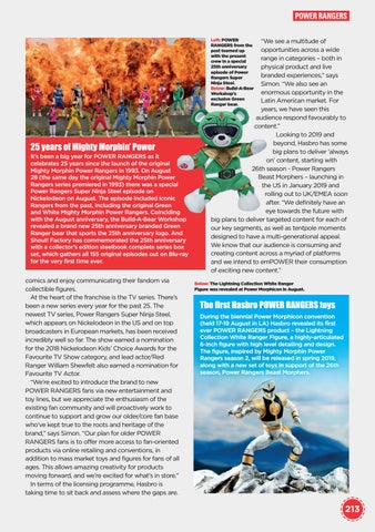 “We see a multitude of opportunities across a wide range in categories – both in physical product and live branded experiences,” says Simon. “We also see an enormous opportunity in the Latin American market. For years, we have seen this audience respond favourably to content.” Looking to 2019 and beyond, Hasbro has some big plans to deliver ‘always on’ content, starting with 26th season - Power Rangers Beast Morphers – launching in the US in January 2019 and rolling out to UK/EMEA soon after. “We definitely have an eye towards the future with big plans to deliver targeted content for each of our key segments, as well as tentpole moments designed to have a multi-generational appeal. We know that our audience is consuming and creating content across a myriad of platforms and we intend to emPOWER their consumption of exciting new content.” Below: The Lightning Collection White Ranger Figure was revealed at Power Morphicon in August.