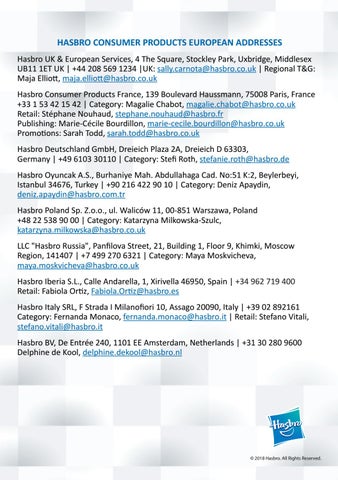HASBRO CONSUMER PRODUCTS EUROPEAN ADDRESSES Hasbro UK & European Services, 4 The Square, Stockley Park, Uxbridge, Middlesex UB11 1ET UK | +44 208 569 1234 |UK: sally.carnota@hasbro.co.uk | Regional T&G: Maja Elliott, maja.elliott@hasbro.co.uk Hasbro Consumer Products France, 139 Boulevard Haussmann, 75008 Paris, France +33 1 53 42 15 42 | Category: Magalie Chabot, magalie.chabot@hasbro.co.uk Retail: Stéphane Nouhaud, stephane.nouhaud@hasbro.fr Publishing: Marie-Cécile Bourdillon, marie-cecile.bourdillon@hasbro.co.uk Promotions: Sarah Todd, sarah.todd@hasbro.co.uk Hasbro Deutschland GmbH, Dreieich Plaza 2A, Dreieich D 63303, Germany | +49 6103 30110 | Category: Stefi Roth, stefanie.roth@hasbro.de