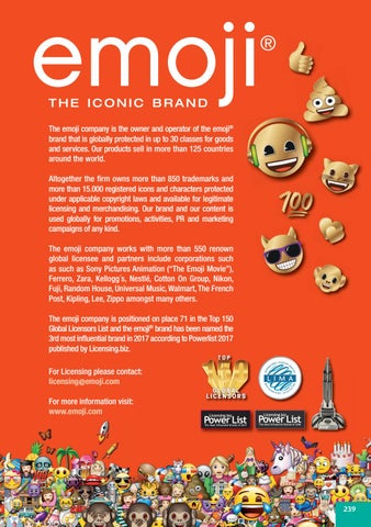 The emoji company is the owner and operator of the emoji® brand that is globally protected in up to 30 classes for goods and services. Our products sell in more than 125 countries around the world. Altogether the firm owns more than 850 trademarks and more than 15.000 registered icons and characters protected under applicable copyright laws and available for legitimate licensing and merchandising. Our brand and our content is used globally for promotions, activities, PR and marketing campaigns of any kind. The emoji company works with more than 550 renown global licensee and partners include corporations such as such as Sony Pictures Animation (“The Emoji Movie”), Ferrero, Zara, Kellogg´s, Nestlé, Cotton On Group, Nikon, Fuji, Random House, Universal Music, Walmart, The French Post, Kipling, Lee, Zippo amongst many others. The emoji company is positioned on place 71 in the Top 150 Global Licensors List and the emoji® brand has been named the 3rd most influential brand in 2017 according to Powerlist 2017 published by Licensing.biz. For Licensing please contact: licensing@emoji.com For more information visit: www.emoji.com
