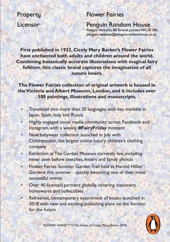 Translated into more than 20 languages with key markets in Japan, Spain, Italy and Russia Highly engaged social media community across Facebook and Instagram, with a weekly #FairyFriday moment New babywear collection launched in July with Childrensalon, the largest online luxury children’s clothing company Exhibition at The Garden Museum currently live, including never seen before sketches, letters and family photos Flower Fairies Summer Garden Trail held at Harold Hillier Gardens this summer - quickly becoming one of their most successful events Over 40 licensed partners globally, covering stationery, homewares and collectibles Refreshed, contemporary assortment of books launched in 2018 with new and exciting publishing plans on the horizon for the future FLOWER FAIRIES™ © The Estate of Cicely Mary Barker 2018