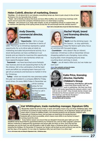 “Exciting – it’s all about Q4 in our industry, everything ramps up, there is just a buzz in the air here at Enesco. It is my favourite time of year. Food – Q4 is literally all about the food, we have office buffets, lots of planning meetings (with lunch) and of course the company Christmas lunch, it is what keeps us going. Pressure – the pressure is on, large sales targets, so lots of marketing activity to support that, not to mention the planning of the spring shows across the UK and Europe and the January launch.” Right: Q4 is a favourite time of year for Helen from Enesco.