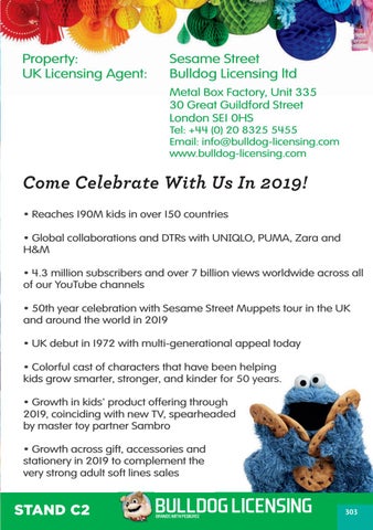 Come Celebrate With Us In 2019! • Reaches 190M kids in over 150 countries • Global collaborations and DTRs with UNIQLO, PUMA, Zara and H&M • 4.3 million subscribers and over 7 billion views worldwide across all of our YouTube channels • 50th year celebration with Sesame Street Muppets tour in the UK and around the world in 2019 • UK debut in 1972 with multi-generational appeal today • Colorful cast of characters that have been helping kids grow smarter, stronger, and kinder for 50 years. • Growth in kids’ product offering through 2019, coinciding with new TV, spearheaded by master toy partner Sambro • Growth across gift, accessories and stationery in 2019 to complement the very strong adult soft lines sales