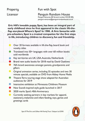 Over 20 formats available in lift-the-flap, board book and novelty titles Translated into 50+ languages with over 60 million books sold worldwide Key territories are UK, USA, Australia, Netherlands Brand new audio books for 2018 read by David Oyelowo 76% brand awareness amongst parents, grandparents and gifters Original animation series, including 55 episodes and two 30 minute specials, available on DVD from Abbey Home Media Theatre Terra touring stage show adapted for Australian audiences for 2019 Interactive exhibition at Minnesota Childrens Museum New Scandi-inspired style guide launched in 2017 2020 marks Spot’s 40th Anniversary Currently seeking partners in key markets for apparel, stationery, melamine and infant feeding, toys, games and greetings cards