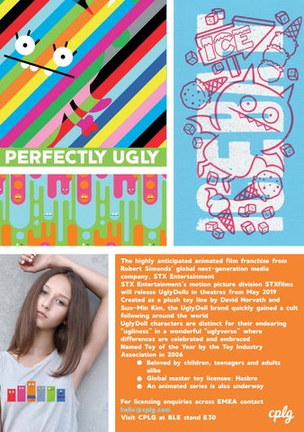 The highly anticipated animated film franchise from Robert Simonds’ global next-generation media company, STX Entertainment STX Entertainment’s motion picture division STXfilms will release UglyDolls in theatres from May 2019 Created as a plush toy line by David Horvath and Sun-Min Kim, the UglyDoll brand quickly gained a cult following around the world UglyDoll characters are distinct for their endearing “ugliness” in a wonderful “uglyverse” where differences are celebrated and embraced Named Toy of the Year by the Toy Industry Association in 2006 Beloved by children, teenagers and adults alike Global master toy licensee: Hasbro An animated series is also underway For licensing enquiries across EMEA contact hello@cplg.com Visit CPLG at BLE stand E30