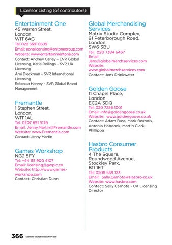 Entertainment One 45 Warren Street, London W1T 6AG Tel: 020 3691 8509 Email: eonelicensing@entonegroup.com Website: www.entertainmentone.com Contact: Andrew Carley – EVP, Global Licensing, Katie Rollings – SVP, UK Licensing Ami Dieckman – SVP, International Licensing Rebecca Harvey – SVP, Global Brand Management