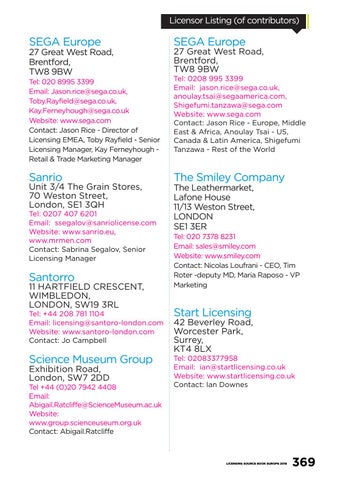Tel: 020 8995 3399 Email: Jason.rice@sega.co.uk, Toby.Rayfield@sega.co.uk, Kay.Ferneyhough@sega.co.uk Website: www.sega.com Contact: Jason Rice - Director of Licensing EMEA, Toby Rayfield - Senior Licensing Manager, Kay Ferneyhough Retail & Trade Marketing Manager