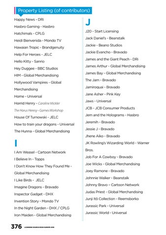 Property Listing (of contributors) Happy News - DRi Hasbro Gaming - Hasbro Hatchimals - CPLG Heidi Bienvenida - Mondo TV Hawaian Tropic - Brandgenuity Help For Heroes - JELC Hello Kitty - Sanrio Hey Duggee - BBC Studios HIM - Global Merchandising Hollywood Vampires - Global Merchandising Home - Universal Horrid Henry - Caroline Mickler The Horus Heresy - Games Workshop House Of Turnowski - JELC How to train your dragons - Universal The Hunna - Global Merchandising