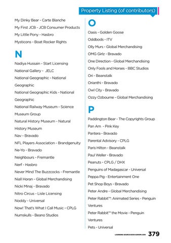 P Paddington Bear - The Copyrights Group Pan Am - Pink Key Pantera - Bravado Parental Advisory - CPLG Paris Hilton - Beanstalk Paul Weller - Bravado Peanuts - CPLG / DHX Penguins of Madagascar - Universal Peppa Pig - Entertainment One Pet Shop Boys - Bravado Peter Andre - Global Merchandising Peter Rabbit™: Animated Series - Penguin Ventures Peter Rabbit™ the Movie - Penguin Ventures Pets - Universal LICENSING SOURCE BOOK EUROPE 2018