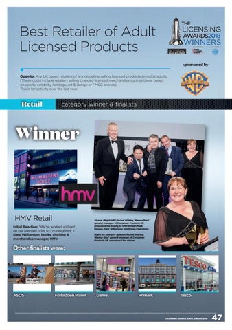 Above: (Right-left) Rachel Wakley, Warner Bros’ general manager of Consumer Products UK presented the trophy to HMV Retail’s Mark Hooper, Gary Williamson and Erwan Chairaham. Right: As category sponsor, Rachel Wakley, Warner Bros’ general manager of Consumer Products UK announced the winner.