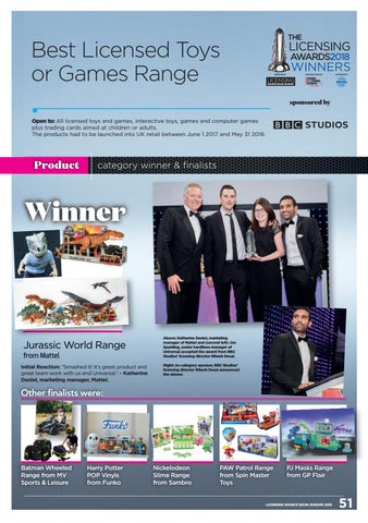 Best Licensed T oys or G ames R ange sponsored by Open to: All licensed toys and games, interactive toys, games and computer games plus trading cards aimed at children or adults. The products had to be launched into UK retail between June 1 2017 and May 31 2018.