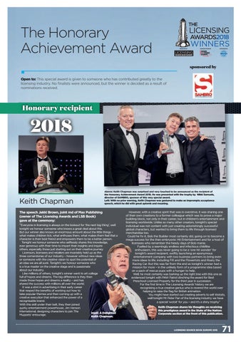 However, with a creative spirit that was in overdrive, it was sharing one of their own creations to a former colleague which was to prove a major building block, not only in their career, but in children’s entertainment and licensing worldwide. Unlike so many other creators, tonight’s special individual was not content with just creating astonishingly successful global characters, but wanted to bring them to life through licensed merchandise too. Could he fix it, Bob the Builder most certainly did, going on to become a mega success for the then embryonic Hit Entertainment and for a host of licensees who remember the heady days of Bob mania. Fuelled by a seemingly endless and infectious childlike enthusiasm, this was never going to be a ‘one hit wonder’ for tonight’s award recipient, swiftly launching an eponymous entertainment company with two business partners to bring even more ideas to life, including Fifi and the Flowertots and Roary the Racing Car. But this was far from the end as tonight’s winner had a mission for more – in the unlikely form of a programme idea based on a pack of rescue pups with a hunger to help. Well, he most certainly was barking up the right tree with this one as evidenced tonight with PAW Patrol clinching the award for Best Preschool Licensed Property for the third year in succession. For the first time in The Licensing Awards’ history we are recognising a true creative genius who is revered the world over helping to raise the flag for British animation. You might have started out creating adverts to sell Wotsits, well tonight Mr Peter Pan of the licensing industry we have a special ‘wotsit’ for you – and it’s a shiny trophy.” Keith Chapman shares his thoughts on receiving this prestigious award in the State of the Nation: Corporate section at the front of this publication.