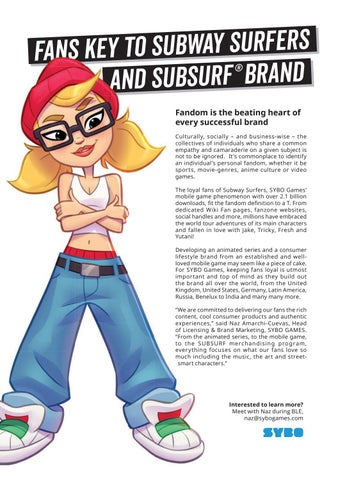 FANS KEY TO SUBWAY S®URFERS AND SUBSURF BRAND Fandom is the beating heart of every successful brand Culturally, socially – and business-wise – the collectives of individuals who share a common empathy and camaraderie on a given subject is not to be ignored. It’s commonplace to identify an individual’s personal fandom, whether it be sports, movie-genres, anime culture or video games. The loyal fans of Subway Surfers, SYBO Games’ mobile game phenomenon with over 2.1 billion downloads, fit the fandom definition to a T. From dedicated Wiki Fan pages, fanzone websites, social handles and more, millions have embraced the world tour adventures of its main characters and fallen in love with Jake, Tricky, Fresh and Yutani! Developing an animated series and a consumer lifestyle brand from an established and wellloved mobile game may seem like a piece of cake. For SYBO Games, keeping fans loyal is utmost impor tant and top of mind as they build out the brand all over the world, from the United ingdom, United States, Germany, Latin America, Russia, Benelux to India and many many more. “We are committed to delivering our fans the rich content, cool consumer products and authentic experiences,” said Naz Amarchi-Cuevas, ead of Licensing Brand arketing, SYBO GA ES. “From the animated series, to the mobile game, to t h e SU B SU R F m e rc han disin g p ro gram , ever y thing focuses on what our fans love so much including the music, the art and streetsmart characters.”