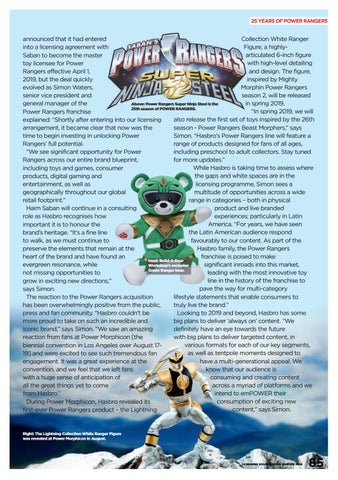 Collection White Ranger announced that it had entered Figure, a highlyinto a licensing agreement with articulated 6-inch figure Saban to become the master with high-level detailing toy licensee for Power and design. The figure, Rangers effective April 1, inspired by Mighty 2019, but the deal quickly Morphin Power Rangers evolved as Simon Waters, season 2, will be released senior vice president and Above: Power Rangers Super Ninja Steel is the in spring 2019. general manager of the 25th season of POWER RANGERS. “In spring 2019, we will Power Rangers franchise also release the first set of toys inspired by the 26th explained: “Shortly after entering into our licensing season - Power Rangers Beast Morphers,” says arrangement, it became clear that now was the Simon. “Hasbro’s Power Rangers line will feature a time to begin investing in unlocking Power range of products designed for fans of all ages, Rangers’ full potential. including preschool to adult collectors. Stay tuned “We see significant opportunity for Power for more updates.” Rangers across our entire brand blueprint, While Hasbro is taking time to assess where including toys and games, consumer the gaps and white spaces are in the products, digital gaming and licensing programme, Simon sees a entertainment, as well as multitude of opportunities across a wide geographically throughout our global range in categories – both in physical retail footprint.” product and live branded Haim Saban will continue in a consulting experiences; particularly in Latin role as Hasbro recognises how America. “For years, we have seen important it is to honour the the Latin American audience respond brand’s heritage. “It’s a fine line favourably to our content. As part of the to walk, as we must continue to Hasbro family, the Power Rangers preserve the elements that remain at the franchise is poised to make heart of the brand and have found an Inset: Build-A-Bear significant inroads into this market, evergreen resonance, while Workshop’s exclusive Green Ranger bear. leading with the most innovative toy not missing opportunities to line in the history of the franchise to grow in exciting new directions,” pave the way for multi-category says Simon. lifestyle statements that enable consumers to The reaction to the Power Rangers acquisition truly live the brand.” has been overwhelmingly positive from the public, Looking to 2019 and beyond, Hasbro has some press and fan community. “Hasbro couldn’t be big plans to deliver ‘always on’ content. “We more proud to take on such an incredible and definitely have an eye towards the future iconic brand,” says Simon. “We saw an amazing with big plans to deliver targeted content, in reaction from fans at Power Morphicon [the various formats for each of our key segments, biennial convention in Los Angeles over August 17as well as tentpole moments designed to 19] and were excited to see such tremendous fan have a multi-generational appeal. We engagement. It was a great experience at the know that our audience is convention, and we feel that we left fans consuming and creating content with a huge sense of anticipation of across a myriad of platforms and we all the great things yet to come intend to emPOWER their from Hasbro.” consumption of exciting new During Power Morphicon, Hasbro revealed its content,” says Simon. first-ever Power Rangers product – the Lightning