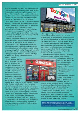 The bigger danger is lack of retailer faith in licensing as a route to market. Some disappointing big movie campaigns last year made supporting hit licences appear just too risky. If buyers play it safe, the default position is to devote more space to generic product. But we must trumpet our credentials here. Retailers want a point of difference in-store, and visually outstanding products that directly connect emotionally with consumers: exactly what a licensed character can deliver. Let’s restore confidence in licensing. Characters encourage footfall, improve tired shopping environments with bursts of colour and energy and add value to generic product categories. Luckily we don’t have to sell misshapen vegetables. Our business is based on selling emotions. Consumers will continue Inset: Grainger Games couldn’t to treat their children – adapt to combat but not with lazy, bland digital downloads. product. We need children to love licensed characters, lines to be imaginative and good value, and parents to understand that magic. If we get that right it doesn’t matter where goods are sold. So don’t obsess about retail decline. Look for retailers who share that wider vision of the importance of the consumer and product quality. They will be the ones who stay relevant and thrive, and licensing will always help them do it. Richard Hollis is a licensing consultant with over 25 years industry experience at the BBC, DreamWorks and Hallmark. You can contact him on richardhollis@rocketmail.com.