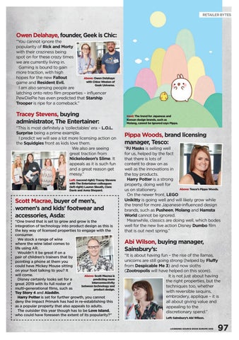“It is about having fun – the rise of the llamas, unicorns are still going strong (helped by Fluffy from Despicable Me 3) and now sloths (Zootropolis will have helped on this score). It is not just about having the right properties, but the techniques too, whether with reversible sequins, embroidery, applique – it is all about giving value and appealing to the discretionary spend.” Left: Sainsbury’s Abi Wilson.