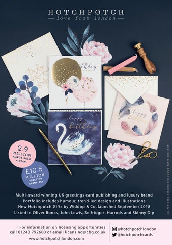Multi-award winning UK greetings card publishing and luxur y brand Por tfolio includes humour, trend-led design and illustrations New Hotchpotch Gifts by Widdop & Co. launched September 2018 Listed in Oliver Bonas, John Lewis, Selfridges, Harrods and Skinny Dip For information on licensing oppor tunities call 01243 792600 or email licensing@cbg.co.uk www.hotchpotchlondon.com Advert.indd 14/09/2018 15:28 - 1 098_LSB_Autumn_2018.indd 100