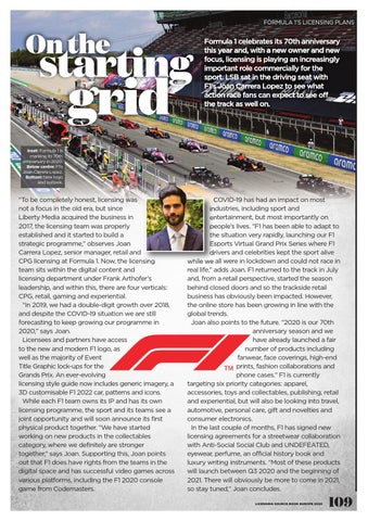 COVID-19 has had an impact on most industries, including sport and entertainment, but most importantly on people’s lives. “F1 has been able to adapt to the situation very rapidly, launching our F1 Esports Virtual Grand Prix Series where F1 drivers and celebrities kept the sport alive while we all were in lockdown and could not race in real life,” adds Joan. F1 returned to the track in July and, from a retail perspective, started the season behind closed doors and so the trackside retail business has obviously been impacted. However, the online store has been growing in line with the global trends. Joan also points to the future. “2020 is our 70th anniversary season and we have already launched a fair number of products including fanwear, face coverings, high-end prints, fashion collaborations and phone cases.” F1 is currently targeting six priority categories: apparel, accessories, toys and collectables, publishing, retail and experiential, but will also be looking into travel, automotive, personal care, gift and novelties and consumer electronics. In the last couple of months, F1 has signed new licensing agreements for a streetwear collaboration with Anti-Social Social Club and UNDEFEATED, eyewear, perfume, an official history book and luxury writing instruments. “Most of these products will launch between Q3 2020 and the beginning of 2021. There will obviously be more to come in 2021, so stay tuned,” Joan concludes. LICENSING SOURCE BOOK EUROPE 2020