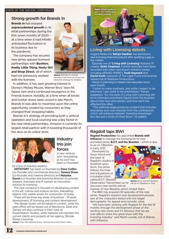 Industry trio join forces A new venture with ‘storytelling at its core’ has been co-founded by a trio of industry experts. ARTiSTORY has been co-founded by Dave Collins (co-founder and commercial director), Tamara Dixon (co-founder and creative director) and Natasha Dyson (co-founder and licensing director) to provide retailers, licensees and IP owners an innovative solution to licensing. The new company is focused on developing content in the art, culture and science sectors, translating objects into usable assets for consumers of today. There will be three key areas of business – IP asset development, IP licensing and content development. The design studio will be based in London, while the sales office will be based out of Barcelona. Dave and Tamara will also continue in their roles at PowerStation Studios, while Natasha will maintain the current clients and projects at her agency, Blonde Sheep Licensing. Above: From left Natasha Dyson, Tamara Dixon and Dave Collins.