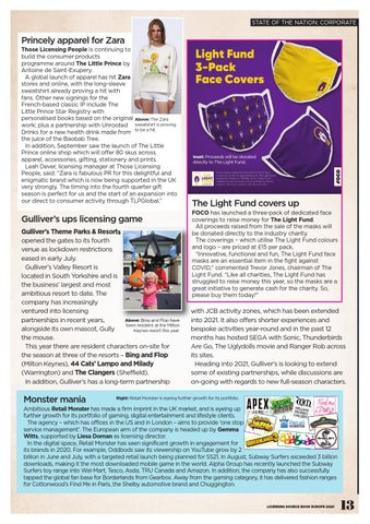 with JCB activity zones, which has been extended into 2021. It also offers shorter experiences and bespoke activities year-round and in the past 12 months has hosted SEGA with Sonic, Thunderbirds Are Go, The Uglydolls movie and Ranger Rob across its sites. Heading into 2021, Gulliver’s is looking to extend some of existing partnerships, while discussions are on-going with regards to new full-season characters.