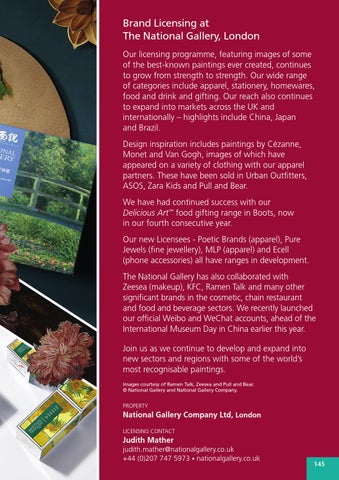 Brand Licensing at The National Gallery, London Our licensing programme, featuring images of some of the best-known paintings ever created, continues to grow from strength to strength. Our wide range of categories include apparel, stationery, homewares, food and drink and gifting. Our reach also continues to expand into markets across the UK and internationally – highlights include China, Japan and Brazil. Design inspiration includes paintings by Cézanne, Monet and Van Gogh, images of which have appeared on a variety of clothing with our apparel partners. These have been sold in Urban Outfitters, ASOS, Zara Kids and Pull and Bear. We have had continued success with our Delicious Art™ food gifting range in Boots, now in our fourth consecutive year. Our new Licensees - Poetic Brands (apparel), Pure Jewels (fine jewellery), MLP (apparel) and Ecell (phone accessories) all have ranges in development. The National Gallery has also collaborated with Zeesea (makeup), KFC, Ramen Talk and many other significant brands in the cosmetic, chain restaurant and food and beverage sectors. We recently launched our official Weibo and WeChat accounts, ahead of the International Museum Day in China earlier this year. Join us as we continue to develop and expand into new sectors and regions with some of the world’s most recognisable paintings. Images courtesy of Ramen Talk, Zeesea and Pull and Bear. © National Gallery and National Gallery Company.