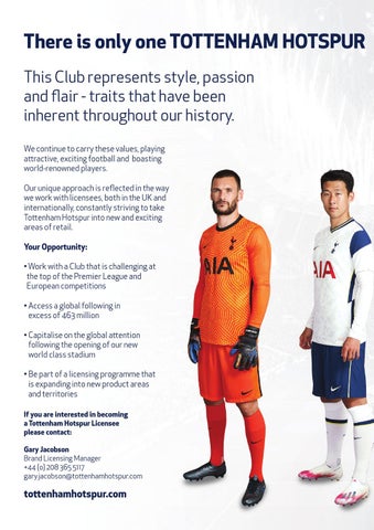 There is only one TOTTENHAM HOTSPUR This Club represents style, passion and flair - traits that have been inherent throughout our history. We continue to carry these values, playing attractive, exciting football and boasting world-renowned players. Our unique approach is reflected in the way we work with licensees, both in the UK and internationally, constantly striving to take Tottenham Hotspur into new and exciting areas of retail. Your Opportunity: • Work with a Club that is challenging at the top of the Premier League and European competitions • Access a global following in excess of 463 million • Capitalise on the global attention following the opening of our new world class stadium • Be part of a licensing programme that is expanding into new product areas and territories If you are interested in becoming a Tottenham Hotspur Licensee please contact: Gary Jacobson Brand Licensing Manager +44 (o) 208 365 5117 gary.jacobson@tottenhamhotspur.com